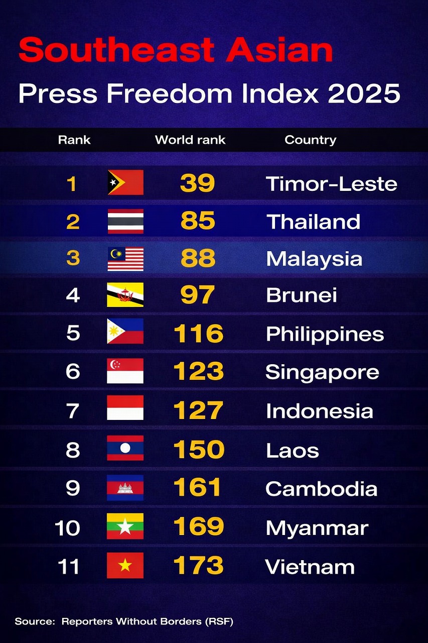 - 報道の自由ランキング、タイ85位、カンボジア161位など、東南アジアは軒並み低ランク。