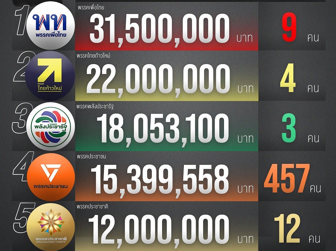 3位はパラン・プラチャーラット党で約1,805万バーツ(寄付者3人)、4位は国民党で約1,539万バーツ(寄付者457人)、5位はプラチャーチャート党で1,200万バーツ(寄付者12人)だった。