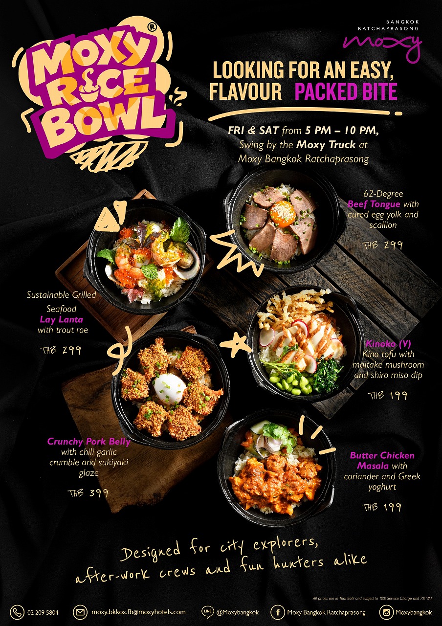 金・土曜限定の「Moxy Rice Bowl Truck」では199バーツからの丼メニューを提供し、屋外テラスの「Kub Klaem」では軽食を99バーツから楽しめます。
