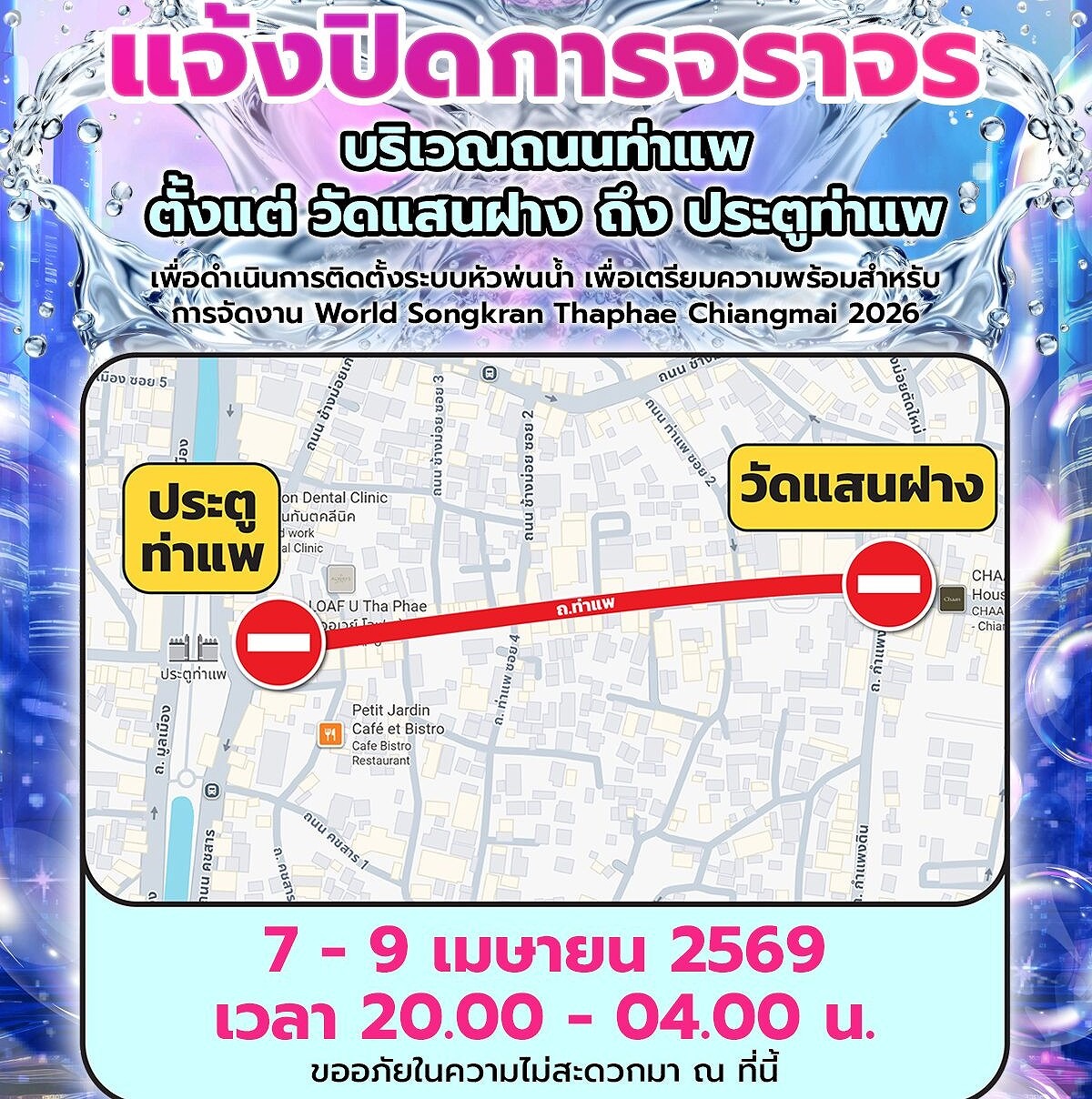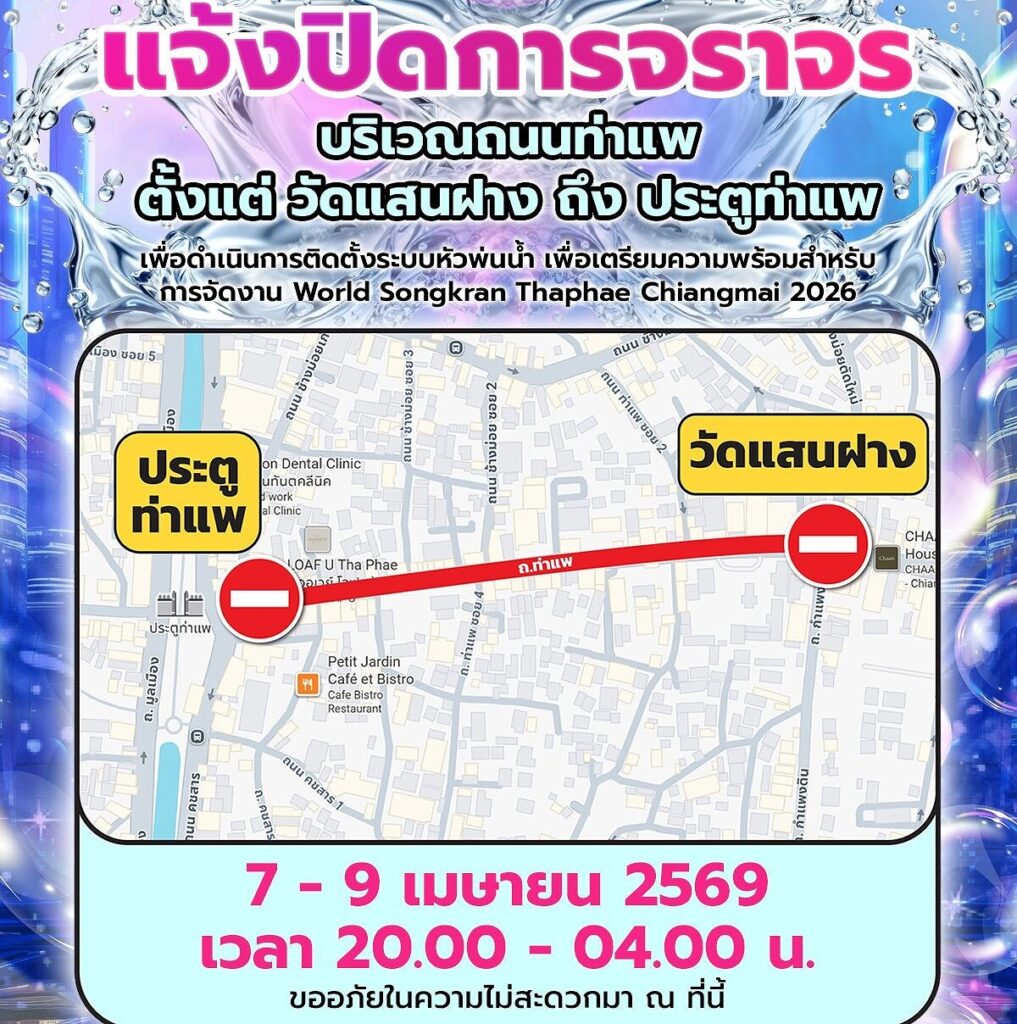 これは「ワールドソンクラーン ターペーチェンマイ 2026」の開催準備として、ウォーター噴射システムの設置を行うためであり、市は市民および通行者に対し不便への理解を求めている。