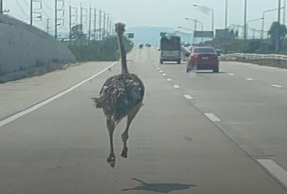 タイの高速道路を爆走するダチョウ! 動物カフェからラヨーン方面へ逃走も、無事確保。