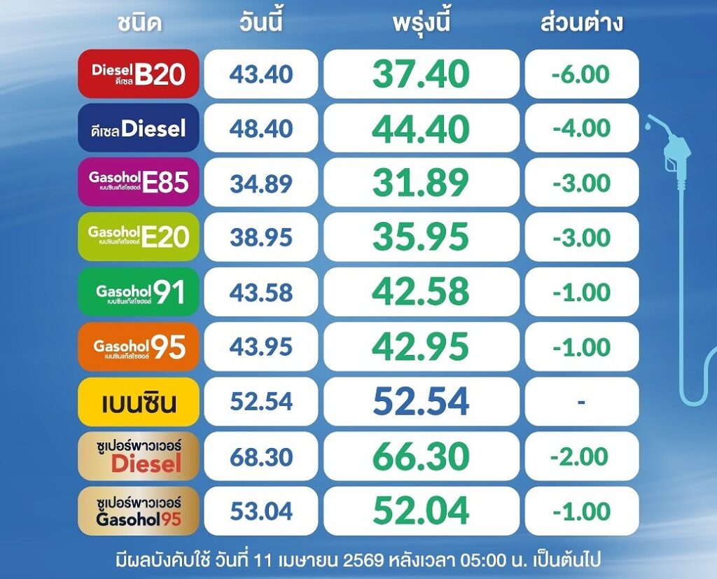 4月11日、タイ・エネルギー省エネルギー政策計画局(EPPO)は、最新の燃料価格を発表した。