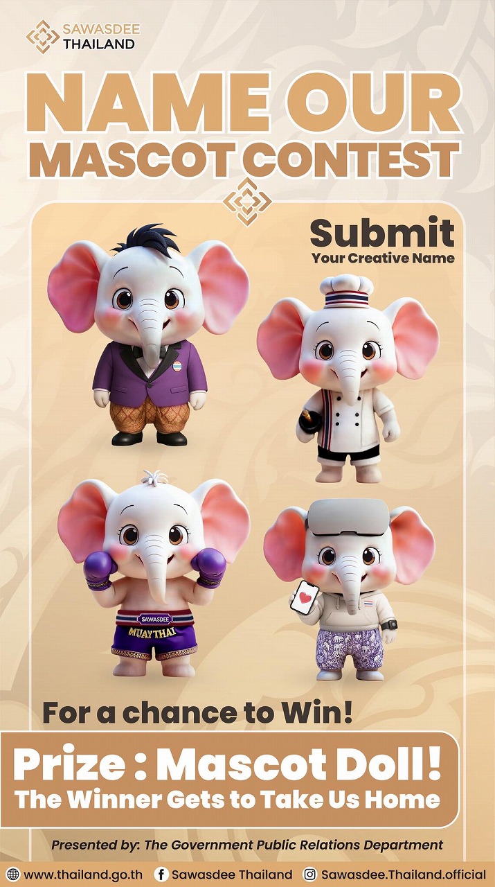 タイ政府公式観光情報サイト「Sawasdee Thailand(thailand.go.th)」は、新たに導入した象のマスコットキャラクターの名称を一般公募すると発表した。