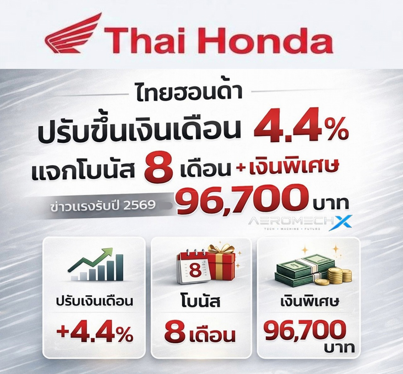 タイホンダ、ボーナス8カ月分・給与4.4%引き上げ、特別手当9万6,700バーツ支給に合意。