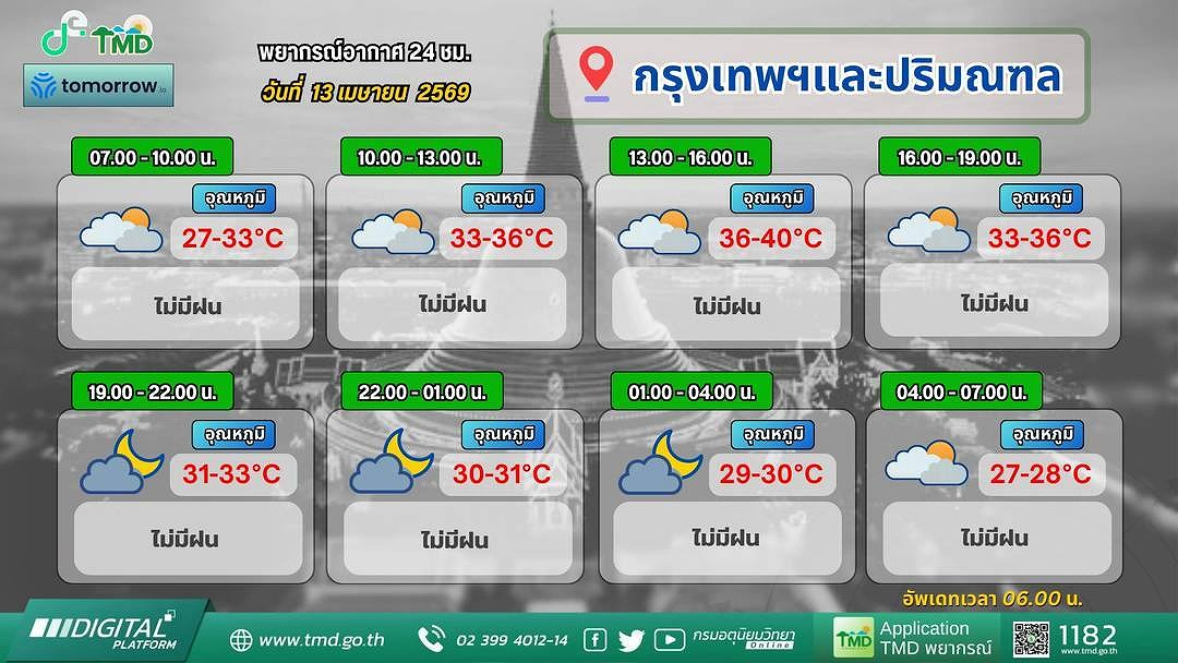 タイ気象局は4月13日、最新の天気予報を発表し、国内各地で厳しい暑さが続くとして注意を呼びかけた。