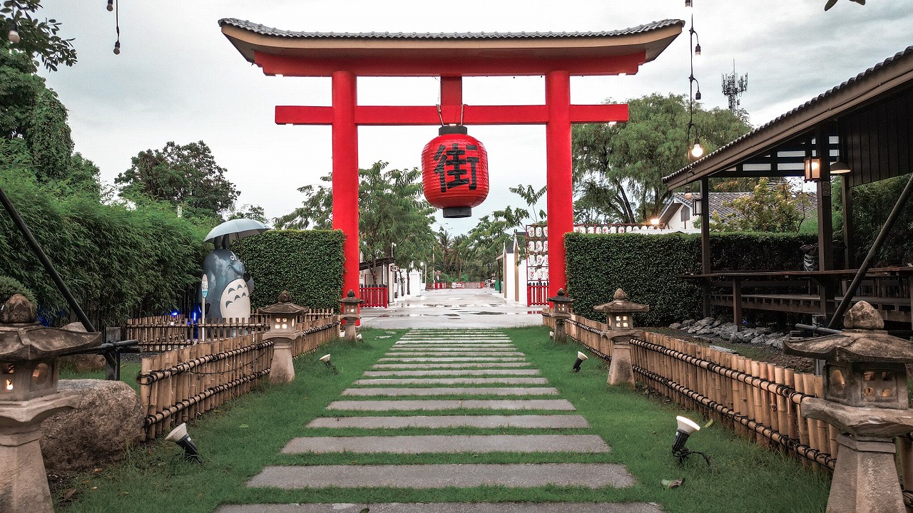 Kan Machi Cafeは、コロナ過が始まろうとしてた2020年2月にオープンし、当初から大きな赤い提灯がある「雷門」風の入り口や、トトロのバス停、枯山水の庭園など、徹底した日本スタイルのコンセプトがタイのSNSで大きな話題となっていた。