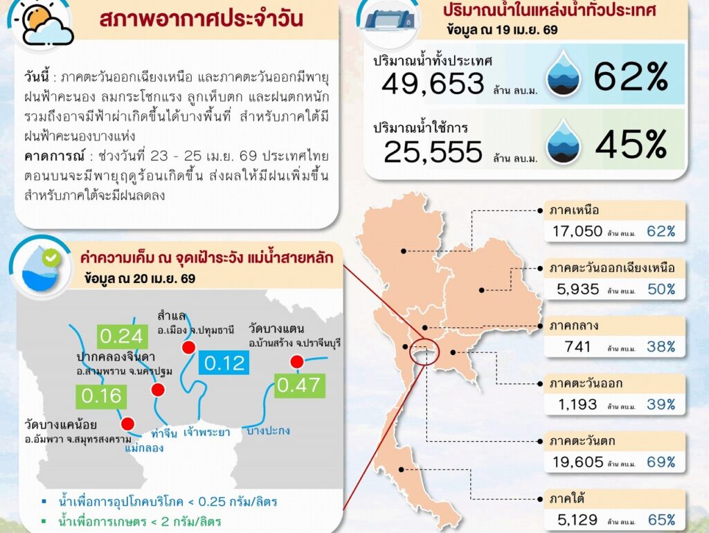 タイ国家水資源事務局は4月20日、国内の水資源状況を発表し、利用可能な水量が全体の45%にとどまっていることを明らかにした。
