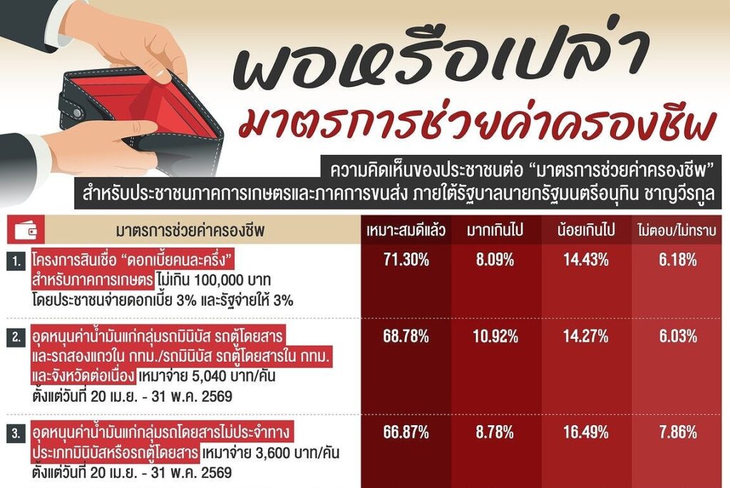 この調査は2026年4月20日から21日にかけて、全国各地域・各職業・各所得層の18歳以上の国民1,310人を対象に実施され、アヌティン首相率いる政府が打ち出した、農業部門・運輸部門を中心とする生活費支援策に対する国民の評価を分析した。