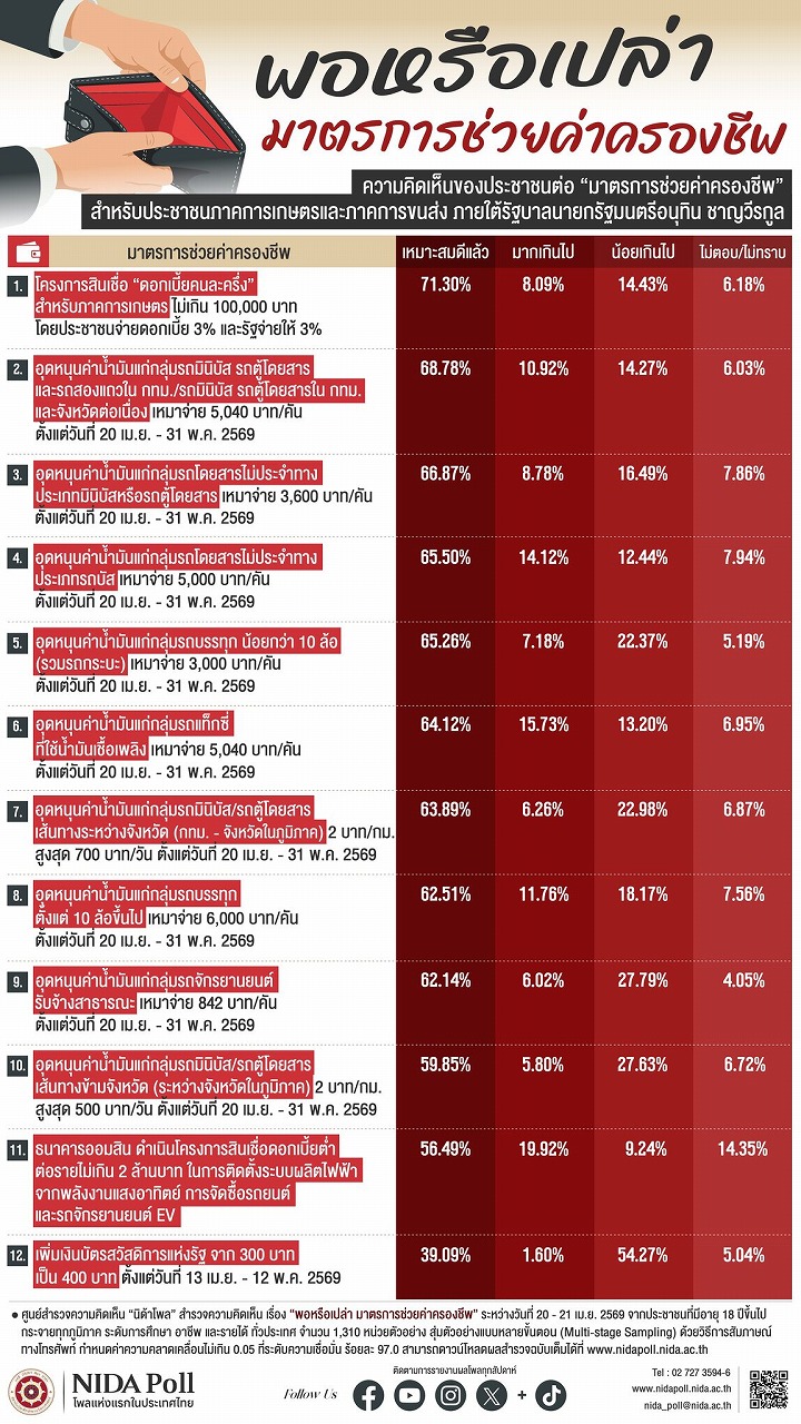 4月26日、国立開発行政研究院(NIDA)の世論調査センター「NIDA Poll」は、「生活費支援策は十分か」をテーマにした最新世論調査結果を公表した。