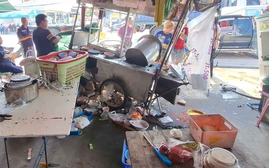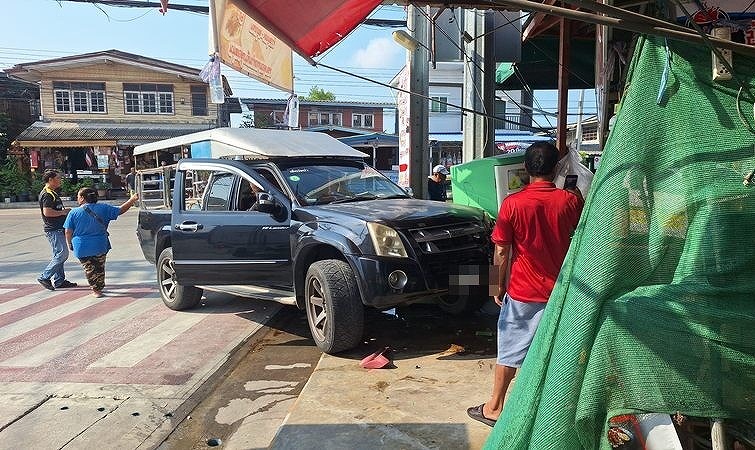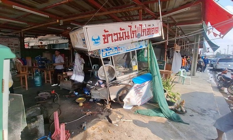 タイ・サムットプラカーン県プラサムットチェディで4月27日朝、建設作業員を乗せたピックアップトラックが乗用車と衝突した後、路肩のカオマンガイ店に突っ込む事故が発生し、店舗が大破した。