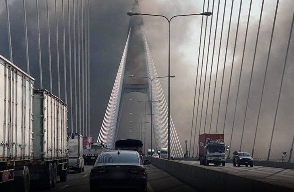 黒煙がプミポン橋周辺覆う! サムットプラカーン工場火災、消火活動難航中。