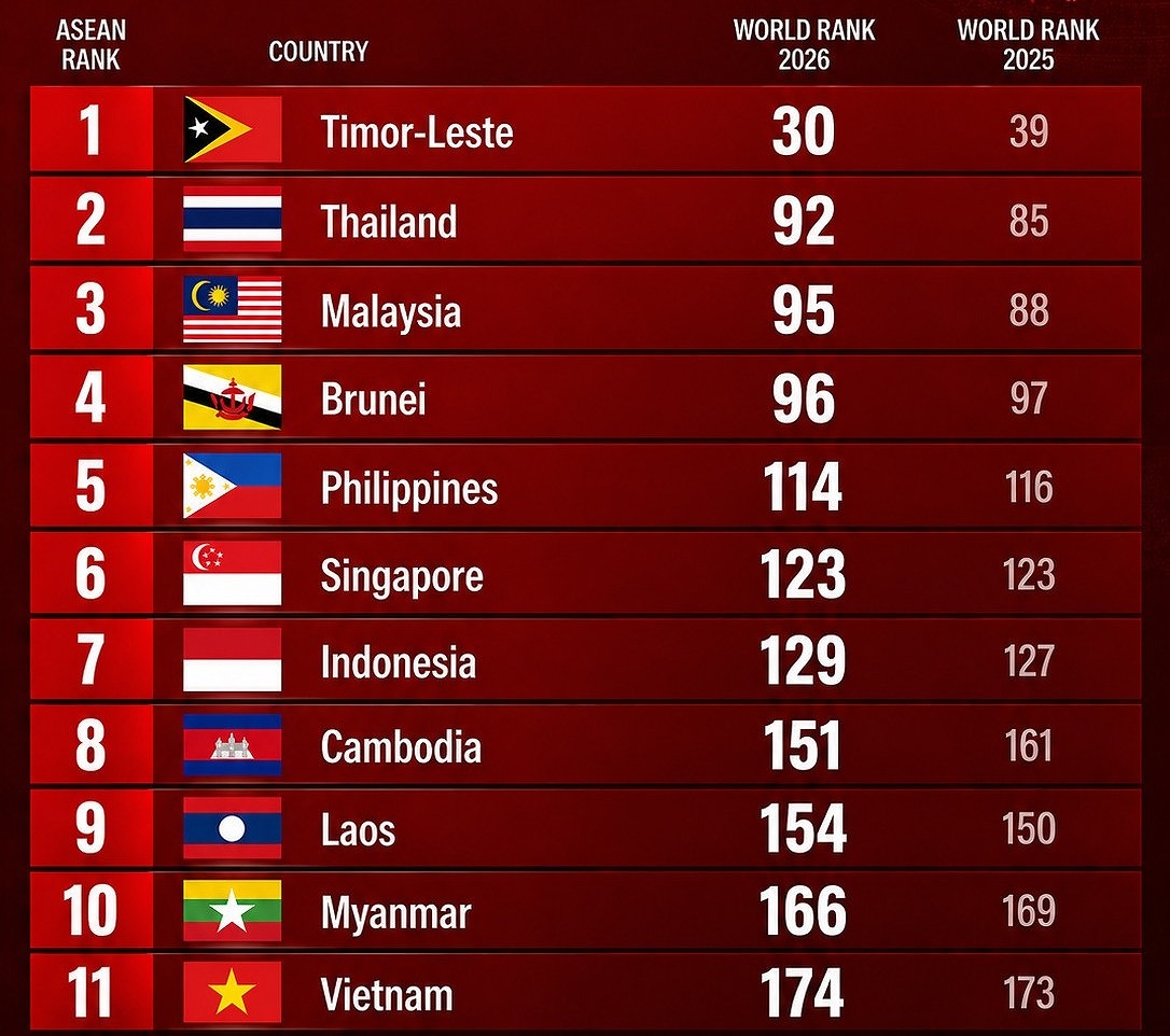 一方、インドネシアは129位に順位を下げた。カンボジアは151位とわずかに改善したが、ラオスは154位へ後退した。