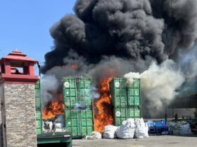 タイ・サムットサコーンで化学物質入りコンテナ6台全焼、消火に3時間以上。