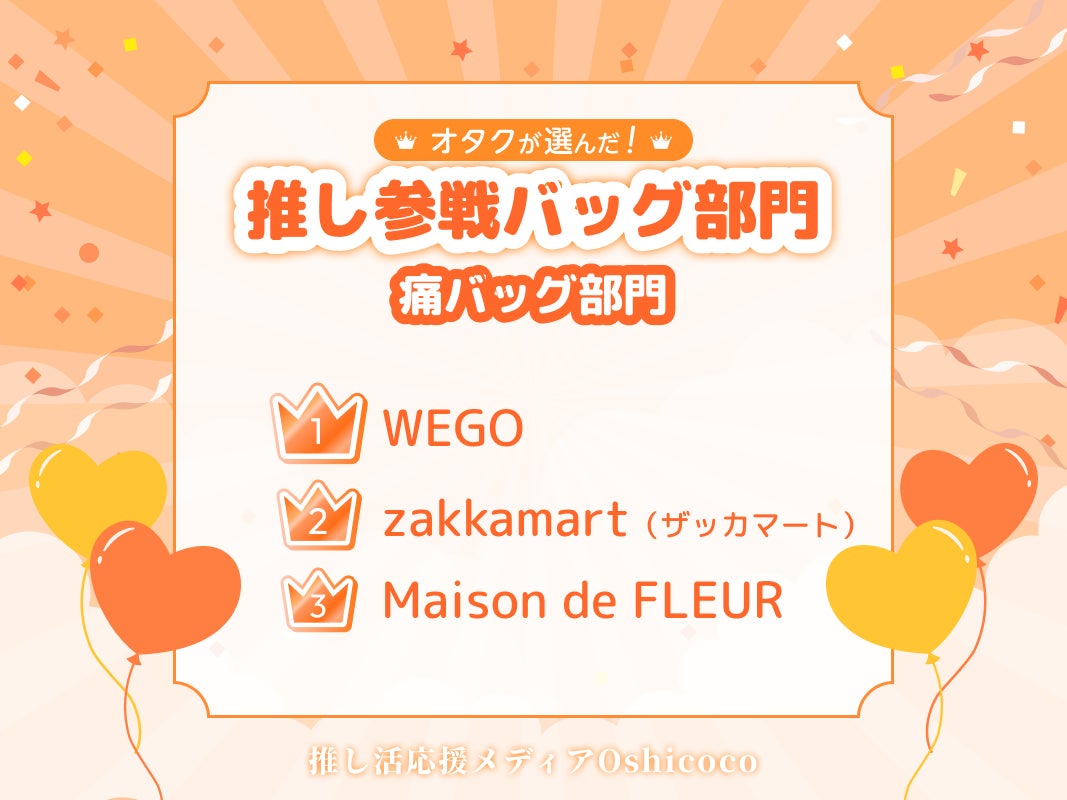 痛バッグ部門では、「WEGO」が前年に引き続き第1位に!2位には「ザッカマート」が続き、低価格と機能性を両立させた痛バッグが推し活層から支持されているようです。また、3位には「Maison de FLEUR」がランクイン。「Maison de FLEUR」のバッグは、裏面がクリア、表は普通のバッグとして使えることが特徴的で、普段使いも推し活利用もOKなのが、推し活層に評価された理由の一つと言えるでしょう!