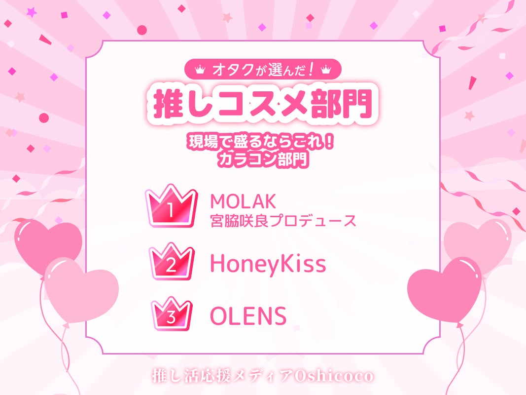 現場で盛るならこれ!カラコン部門では、1位に「MOLAK」2位に「HoneyKiss」3位に「OLENS」が入賞しました。シンプルな色使いのもので、自然に目を大きく見せるようなカラコンが人気となっている傾向がありそうです。