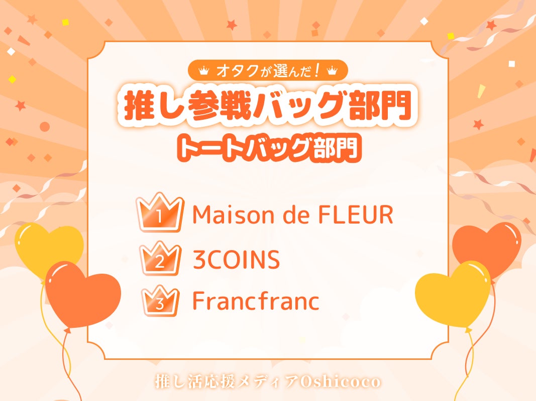 トートバッグ部門では1位に「Maison de FLEUR」2位に「3COINS」3位に「Francfranc」がランクイン!うちわやペンライトなど、かさばりやすい推し活グッズをすっきり収納できる実用性が、人気の理由となったようです。