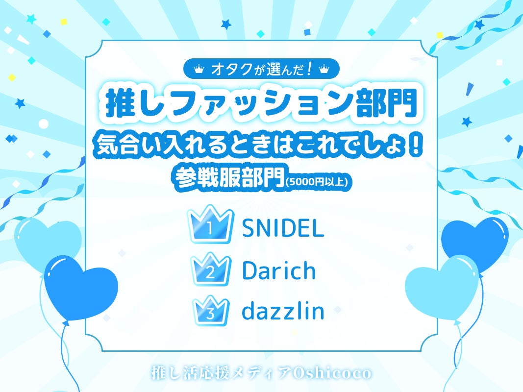 気合い入れるときはこれでしょ!参戦服部門(5000円以上)では、1位「SNIDEL」2位「Darich」3位「dazzlin」が入賞しました。普段はプチプラのお洋服を着ていても、イベントやライブの時には、せっかくだから気合を入れて推しに可愛い姿を見せたい・・・!!そんな特別な機会にぴったりな、背伸びをして買いたくなるようなブランドが人気を集めました。