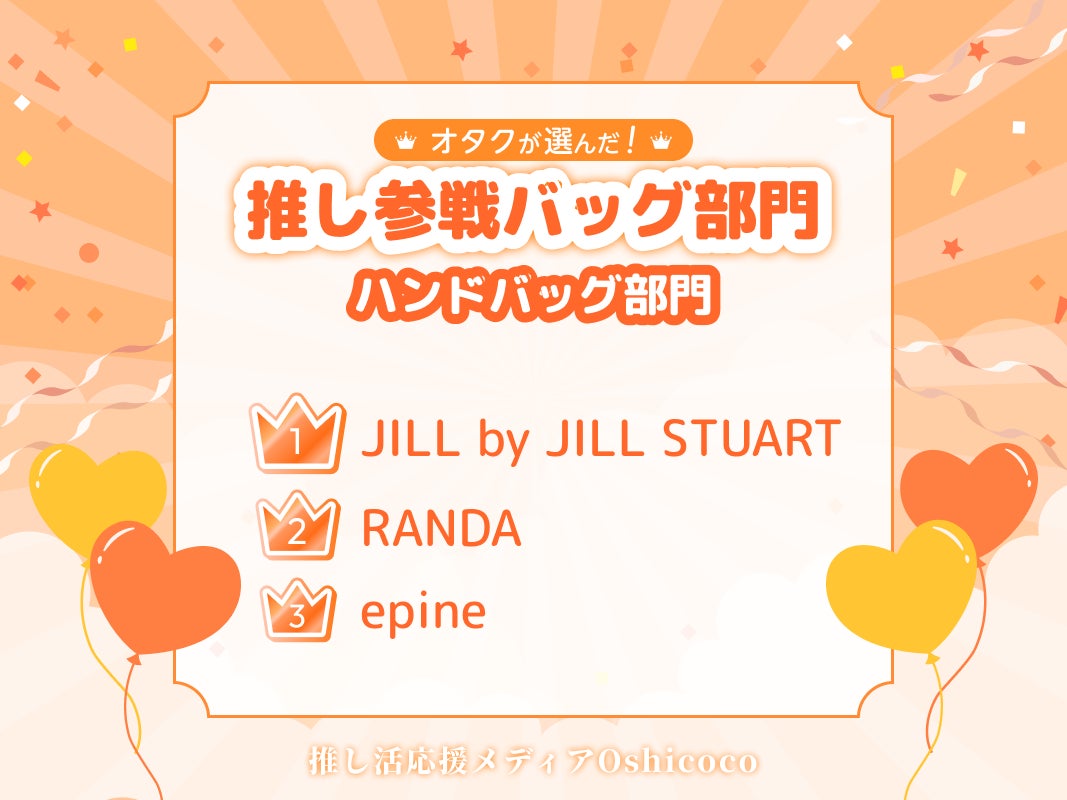 ハンドバッグ部門では、1位に「JILL by JILL STUART」2位に「RANDA」「epine」がランクイン。ミニサイズながら、ハンドバッグも参戦ファッションの大切な「一部」。首下界隈と呼ばれる、首より下を写真に写すのが今年の流行りとしてありましたが、そういった写真撮影の時にも、ミニバッグの存在感は非常に大きかったですよね。