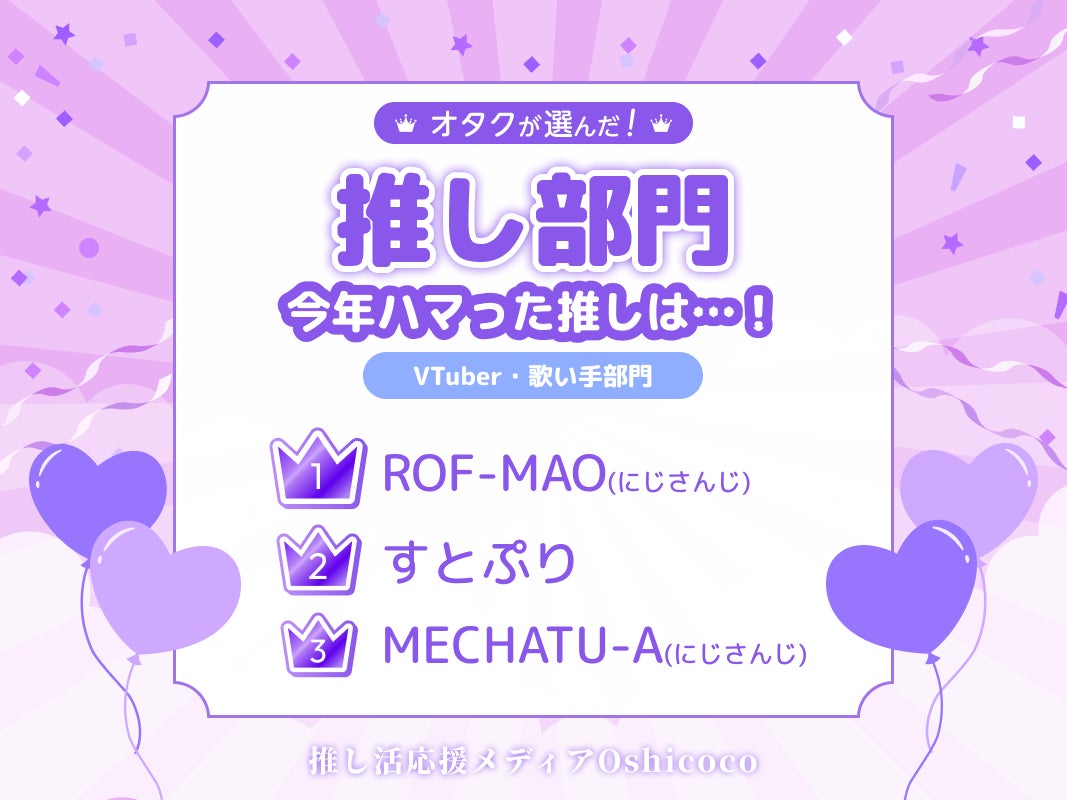 Vtuber・歌い手部門では、1位に「ROF-MAO(にじさんじ)」2位に「すとぷり」3位に「MECHATU-A(にじさんじ)」がランクインしました!今年は個人よりもユニットとしての魅力が注目された一年になったようです。バラエティにも挑戦し、色々な姿を見せながら活動する様子が、推し活層の心に刺さっています。