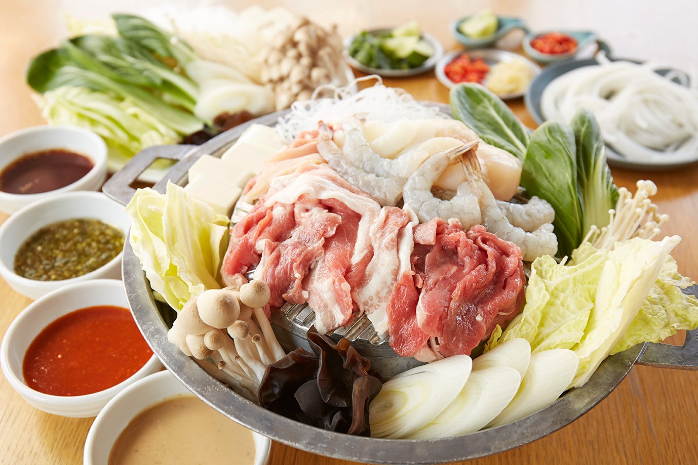 4. 野菜は軽く煮えたらOK、マンゴツリーオリジナルの旨辛タイスキソースなどのつけダレでお召し上がりください