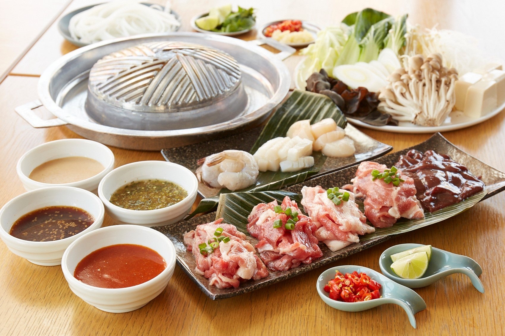 BBQと“タイスキ”*を一度に楽しめる“ムーガタ”。ムー(หมู)は「豚」、ガタ(กระทะ)は「浅い鍋」のことで、一風変わった形のお鍋の真ん中でお肉やシーフードを焼いて、外側のお鍋の部分にチキンスープを入れて野菜や豆腐などを煮込む料理です。真ん中のドームの部分で焼いたお肉やシーフードの旨みが周りのお鍋に程よく落ちて、旨みたっぷりのお鍋に。