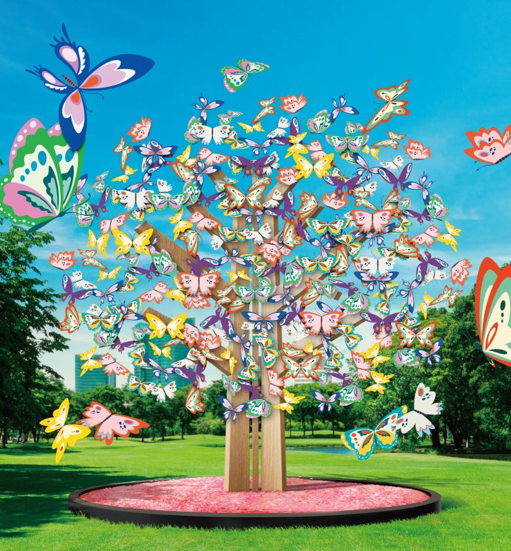 ブース中央に置かれた木のモニュメントにスマートフォンのカメラをかざすと蝶や桜が現れるARアートが登場します。デザインはアーティストの澁谷忠臣氏、オノルイーゼ氏が手掛けており、桜を見逃してしまった方も一服しながらお花見をお楽しみいただけます。