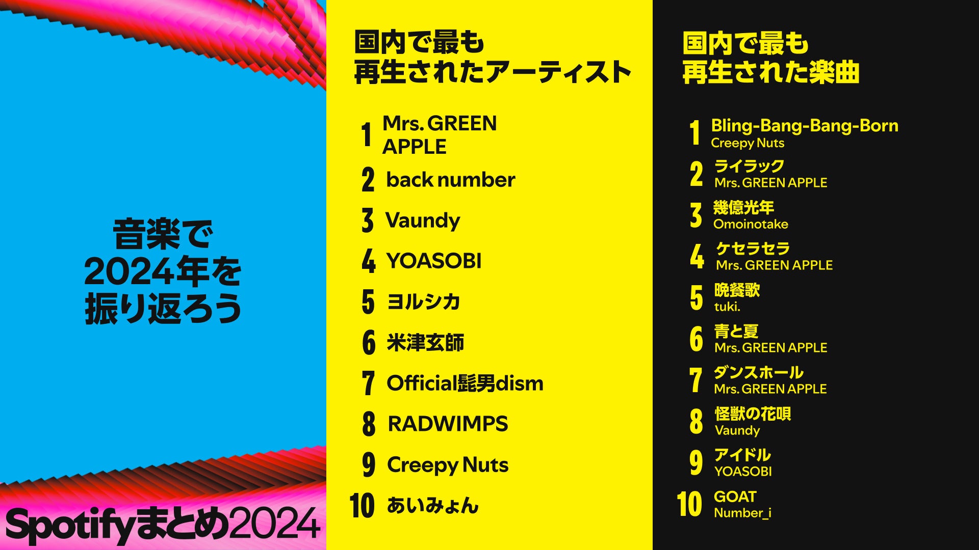 ● 2024年に国内で最も聴かれたアーティストは2年連続でMrs. GREEN APPLE、海外で最も再生された国内アーティストは4年連続でYOASOBI