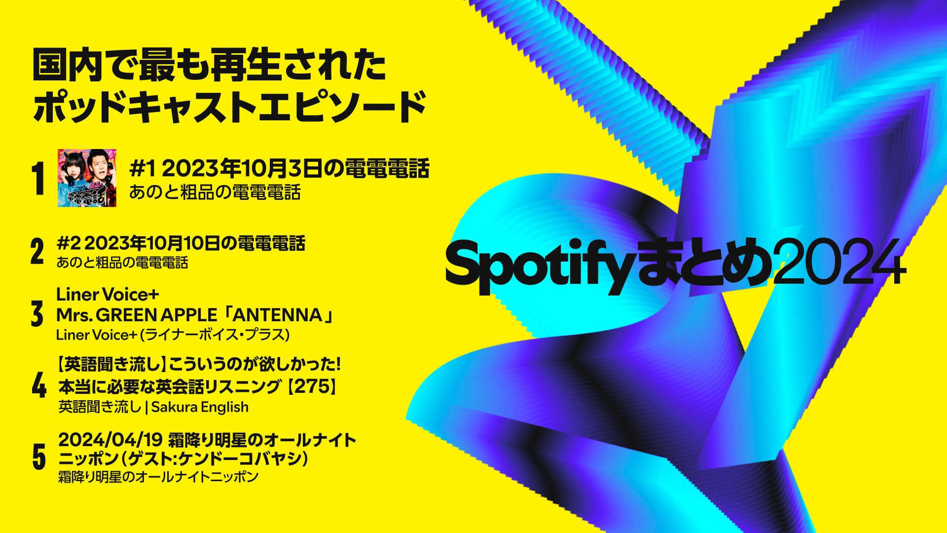 Spotifyでは、今年国内で最も再生されたポッドキャストエピソードを初めて発表し、テレビ東京の音楽トークバラエティ「あのちゃんの電電電波♪」のスピンオフとして2023年10月に始まったポッドキャスト「あのと粗品の電電電話」が1位と2位を独占しました。あのちゃんと霜降り明星・粗品による台本なしの雑談トークを配信する同番組は、音声コンテンツの魅力である自然体な会話を楽しめる場として人気を博し、今年新たに80万人以上のリスナーを獲得しました。