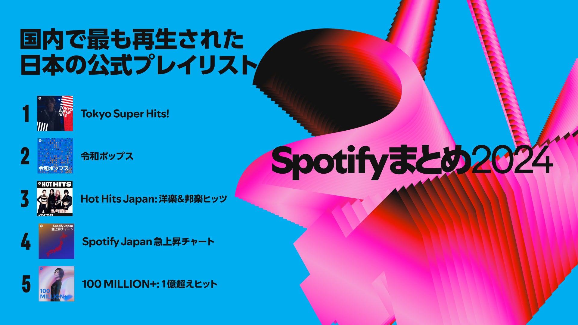 国内で最も再生されたSpotify公式プレイリストは、昨年に続き「Tokyo Super Hits!」、「令和ポップス」(順位要確認)、「Hot Hits Japan: 洋楽&邦楽ヒッツ」がトップ3を占める結果となりました。Spotifyで1億再生を突破した楽曲のみを集めたプレイリスト「100 MILLION+: 1億超えヒット」は、国内外で人気を集める多様なストリーミングヒットを142曲網羅した内容で、初のランクインを果たしました。