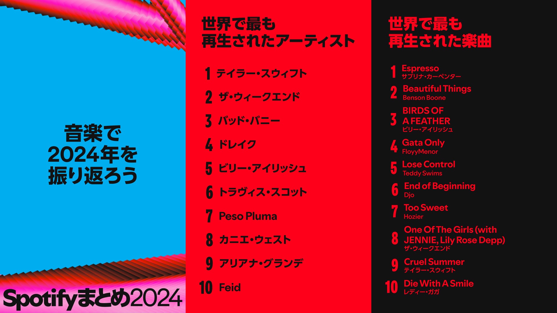 ● 2024年に世界で最も聴かれたアーティストは2年連続でテイラー・スウィフト、最も聴かれた楽曲はサブリナ・カーペンター「Espresso」
