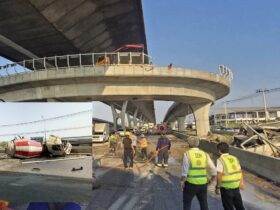 バンコク郊外、コンクリート車がUターン橋から転落、走行車に直撃する事故。付近は大渋滞。