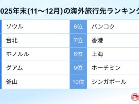 株式会社オープンドア(本社:東京都港区、代表取締役社長:関根大介)が運営する旅行比較サイト「トラベルコ」(https://www.tour.ne.jp/)は、サイト内の検索データをもとに、「2025年末(11〜12月)の…