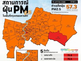バンコク都大気質情報センターは、2026年1月16日午前7時時点のバンコク都における微小粒子状物質(PM2.5)の状況を発表した。 バンコク全体の平均値: 57.3マイクログラム/立方メートル(µg/m³) ※基準…