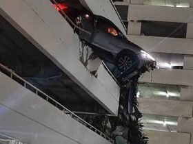 バンコク・クロントゥーイの駐車場2階で事故。車が外壁を超えて落下寸前、衝撃の瞬間。