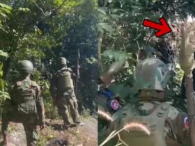 動画内でカンボジア兵は、タイ兵が自国領土を侵犯していると主張して…