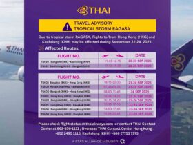 タイ国際航空(THAI)は、台風「RAGASA」が、台湾および香港特別行政区を通過している影響により、バンコク発着の一部便に運航影響が出る可能性があると発表しました。